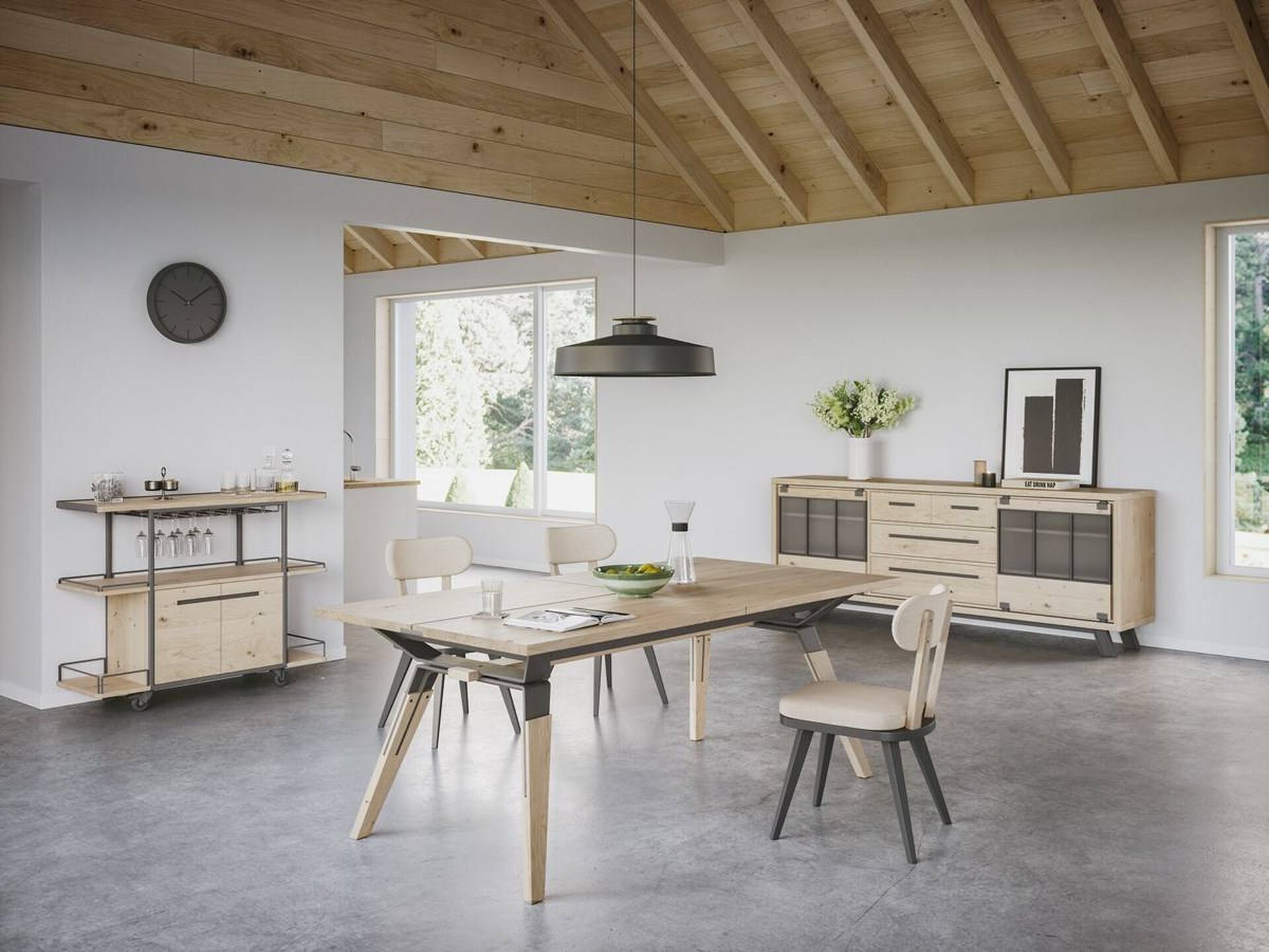 Votre magasin USIMEUBLE vous propose à la vente cette magnifique salle à manger complète en bois SAINT JAMES de fabrication artisanale. Elle existe en 2 teintes : Chêne naturel ou chêne brut avec une céramique time black.