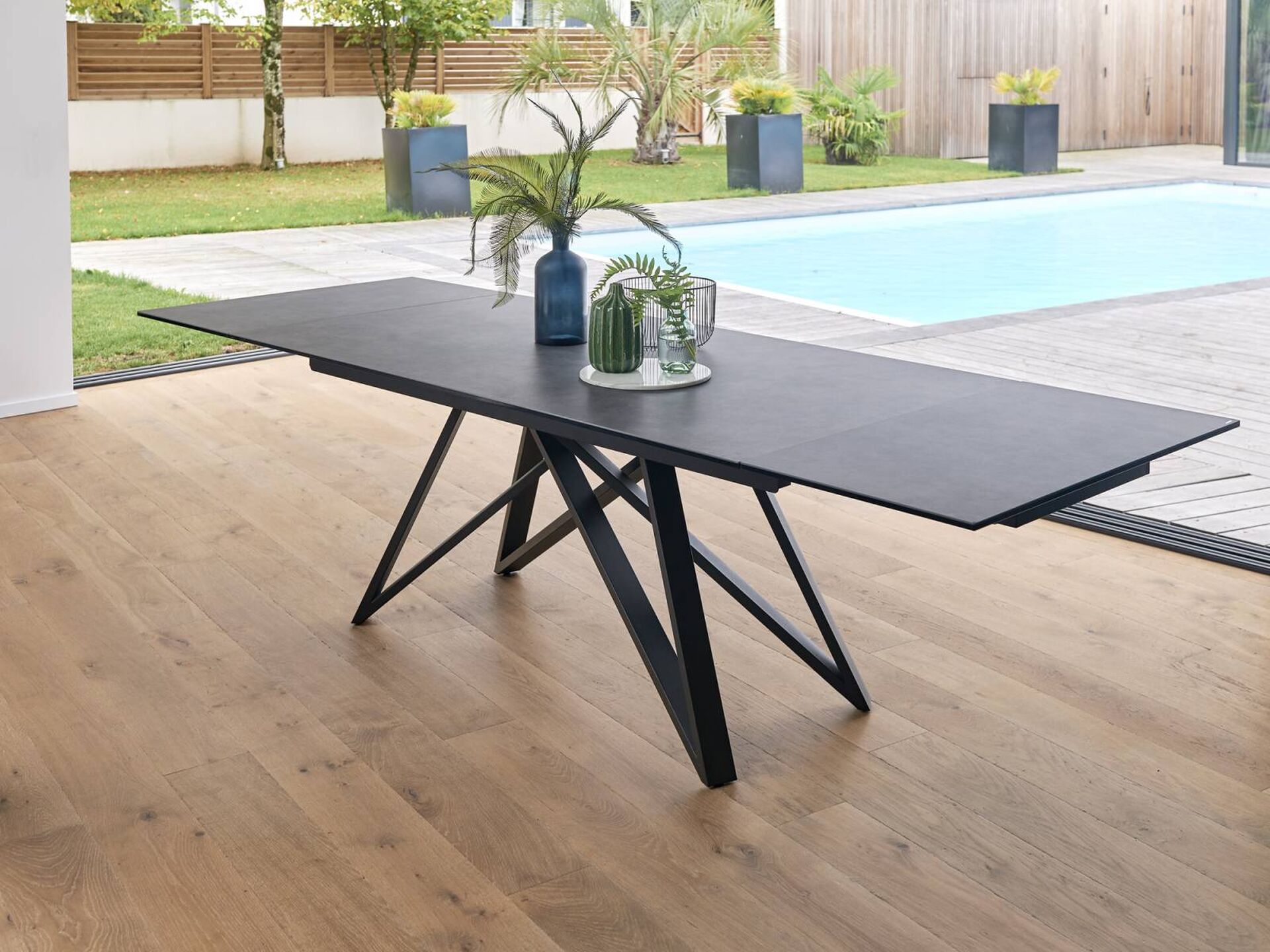 Votre magasin USIMEUBLE vous propose à la vente cette table céramique LILAS. Le plateau est full céramique gris moucheté avec une épaisseur de 13 mm et 2 allonges en bout escamotables de 50 cm. Le piétement est en métal gris anthracite finition poudre. Les pieds sont en croisillons. Table LILAS mesure 180cm x95 cm. Pour découvrir cette table céramique LILAS, rendez-vous dans notre magasin USIMEUBLE situé à 10 minutes de Fécamp.